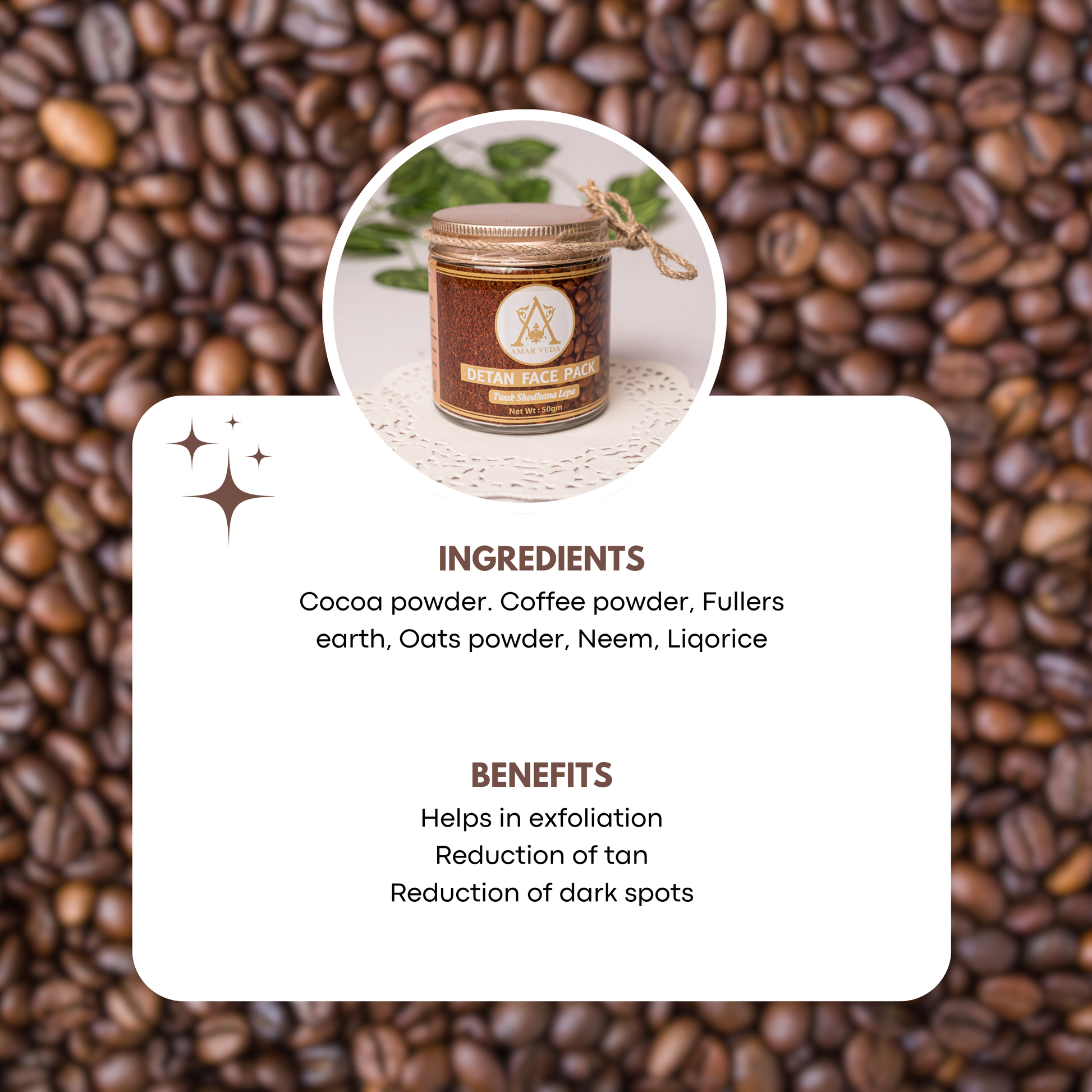 Restore your skin’s natural radiance with Amarveda’s Detan Pack, a potent blend of Cocoa and Coffee that helps reduce tan and dark spots for a brighter, more even complexion. Multani Mitti and Oats deeply hydrate and nourish, while Neem and Mulethi detoxify and purify your skin. This all-natural formula gently revitalizes, leaving your skin feeling refreshed, smooth, and glowing.